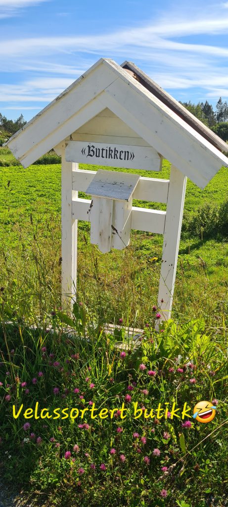 På veien syklet vi forbi Frøyas antatt minste butikk! Til informasjon; det er kun plass til en, helst litt småvokst kunde om gangen 🤣